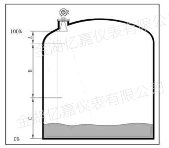 介質為低介電常數當其處于低液位時,罐低可見,此時為保證測量精度,建議將零點定在低高度為C 的位置。